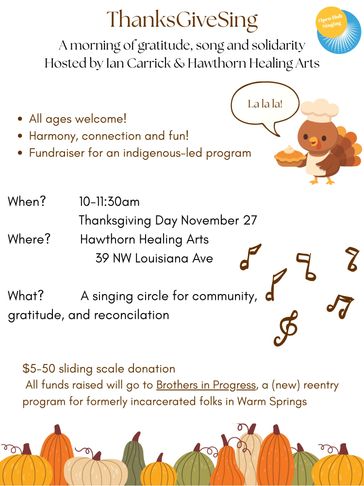 Join us for ThanksGiveSing—a warm, community-building gathering of harmony, connection, and shared gratitude. Hosted by Ian Carrick and Hawthorn Healing Arts, this morning of song invites all ages and voices to help uplift a meaningful cause.
